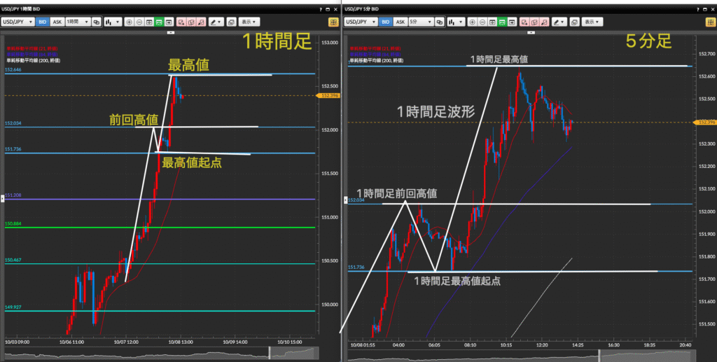 こうすることで5分足を見た時に、今は中途半端なところにいるな…ってめちゃわかりやすくないですか?