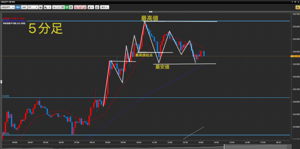 5分足で最高値の起点でロングで順張りしようと思ってもそのまま下降トレンドに転換しちゃってますよね。