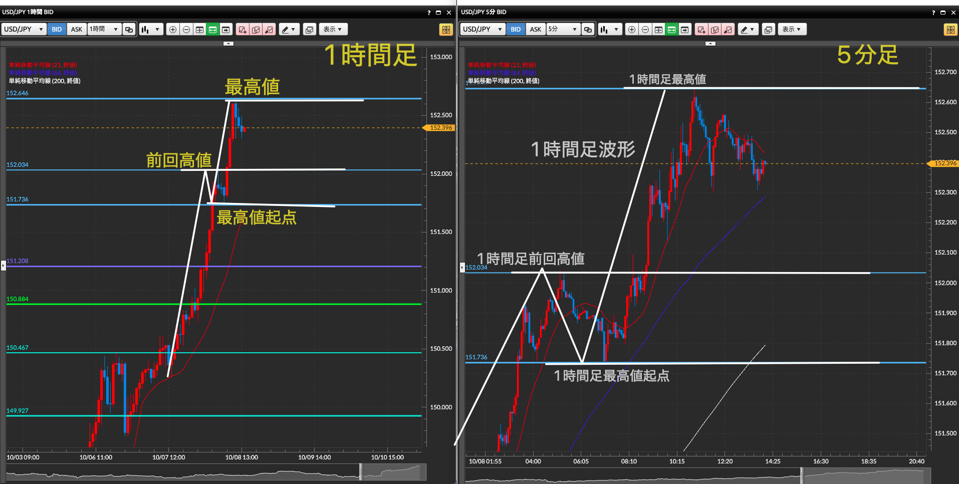 このように並べて表示させたり、僕のお勧めは5分足に1時間足の波形を描いておく!