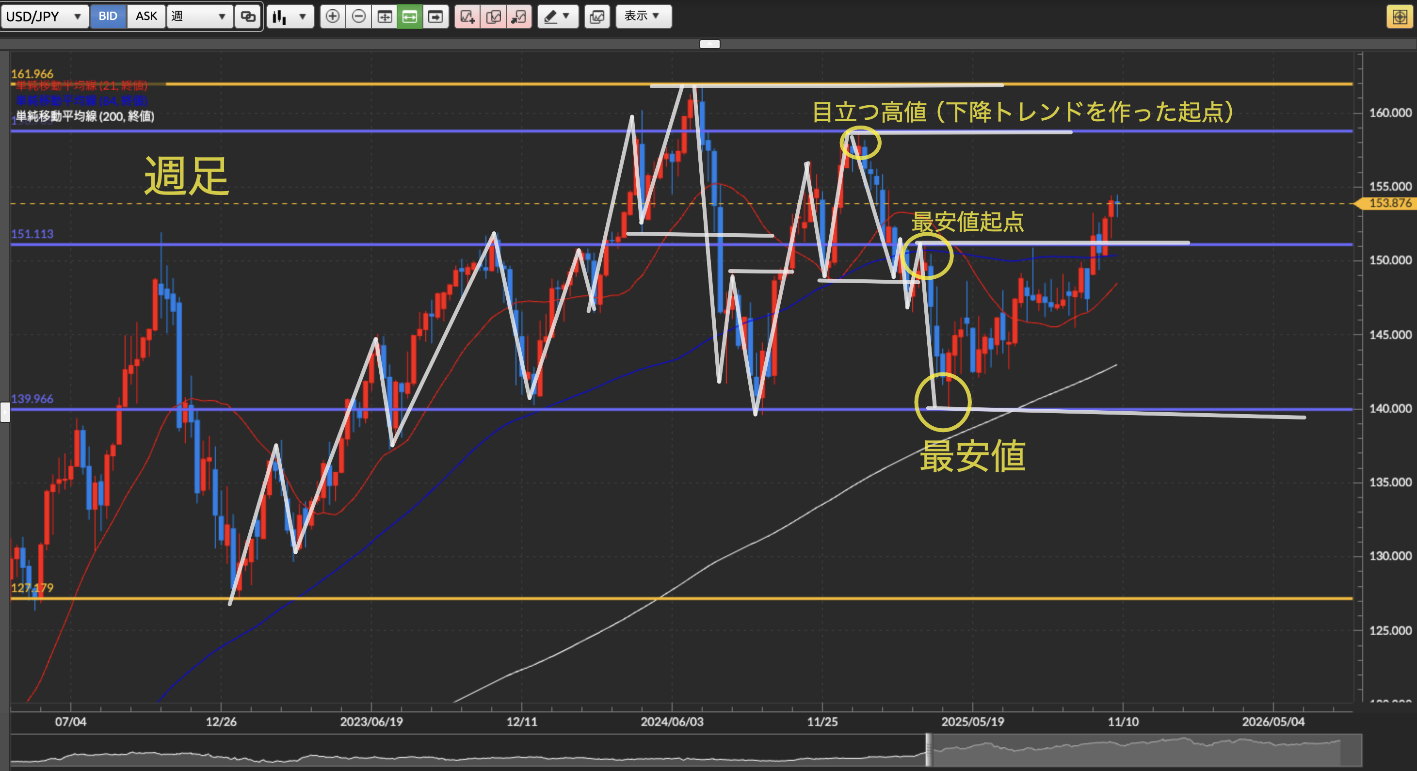 ・週足で直近の高値と安値、抜けた後のために過去の目立つ高値や安値を意識しておく