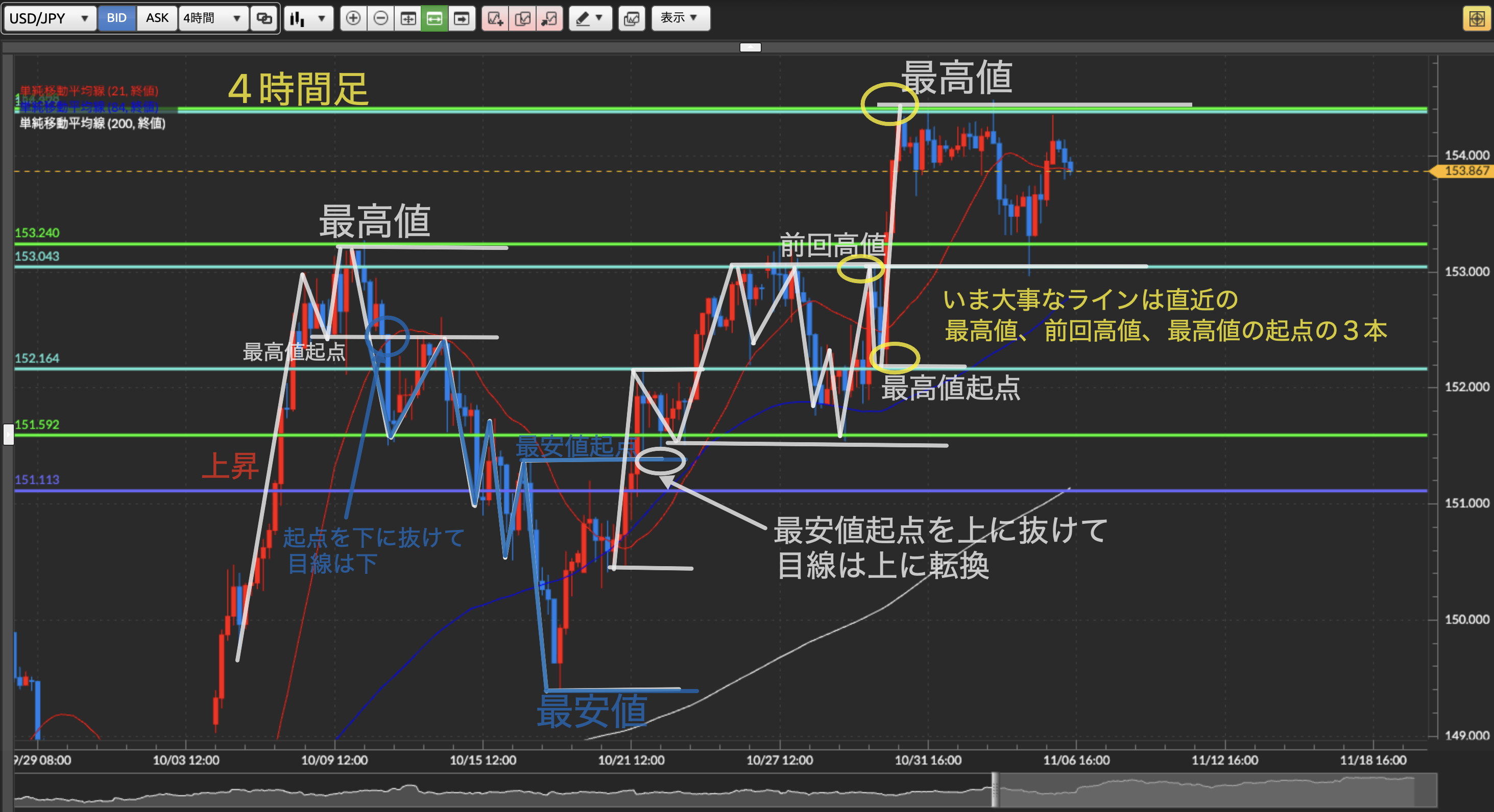大事なのは直近の最高値、前回高値、最高値を作った起点、この3本線が基本となるラインになります。