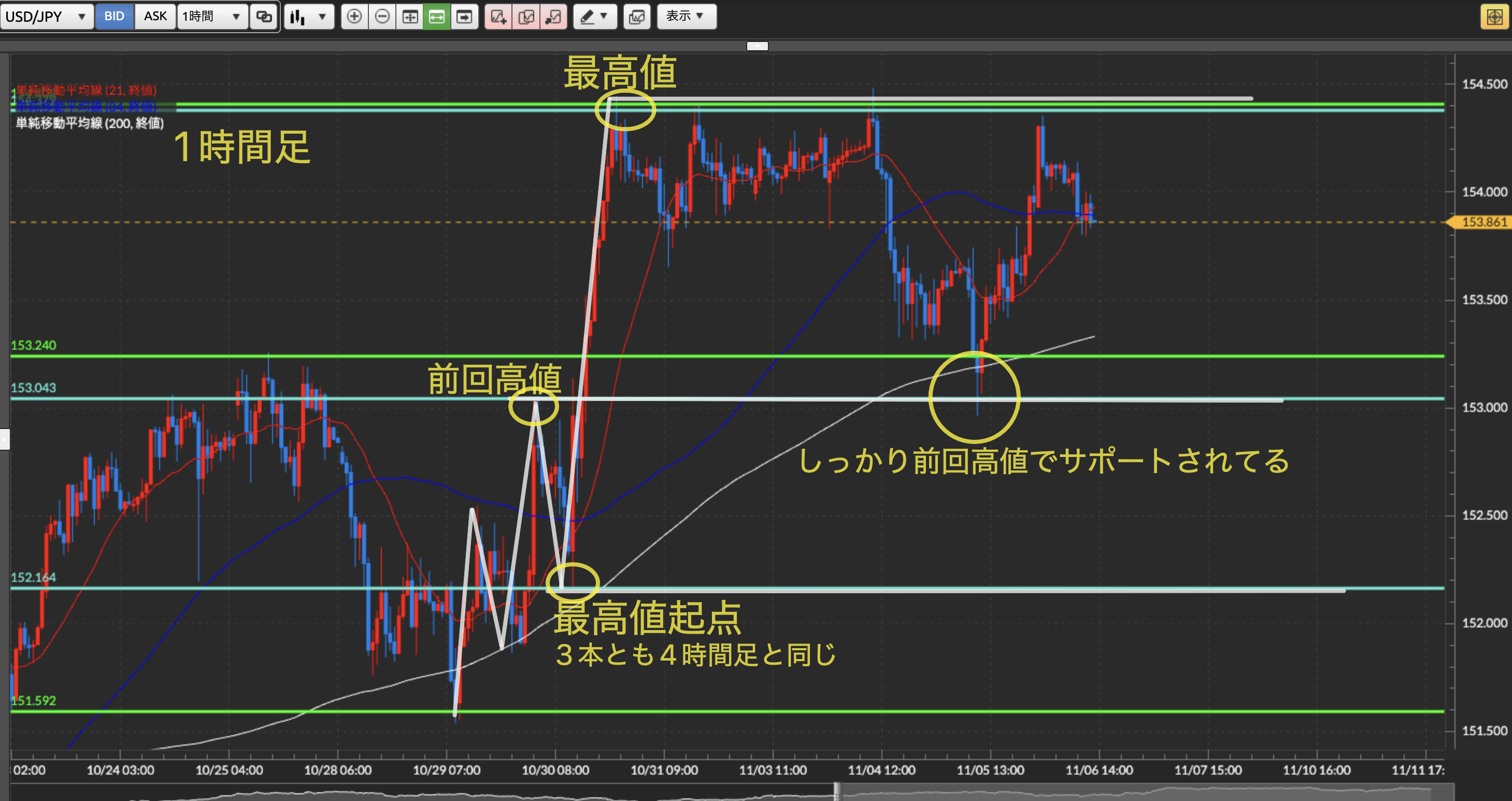 4時間足の上昇トレンドをさらに下の1時間足でも見てみます。