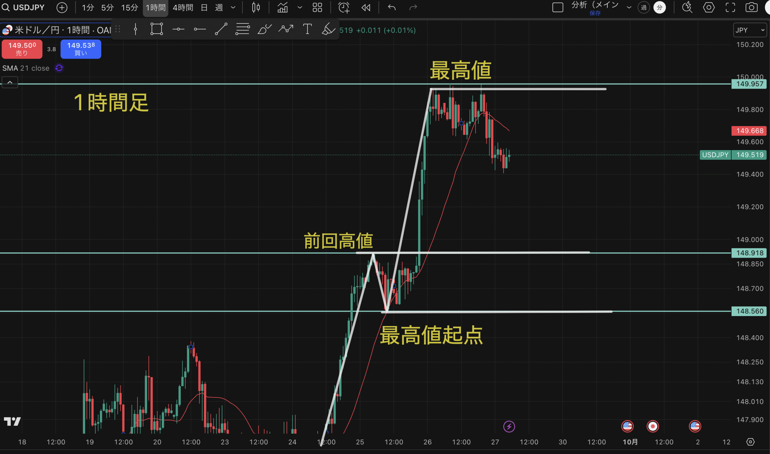 ダウ理論を基に目線の概念、水平線の引き方を理解しているものとして進めさせて頂きます。
