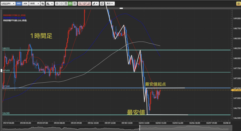 1時間足でも下降トレンド中だが一旦下げ止まりレンジを形成。