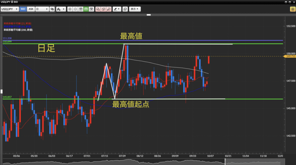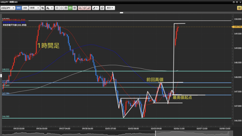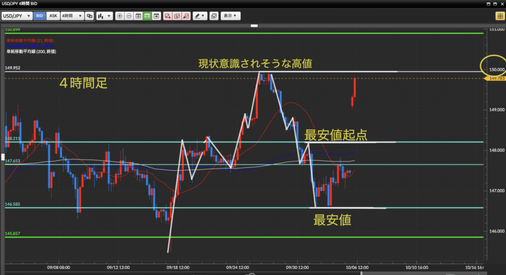 ローソク足が飛んじゃってるので水平線も引きにくいですが、現状意識されそうなのは150円キリ番と、近くの高値ですね。