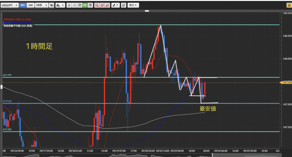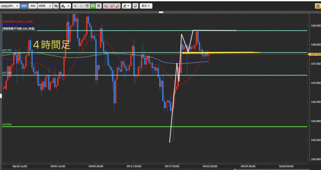 4時間足の最高値起点を下に割ったが下げ切らず…