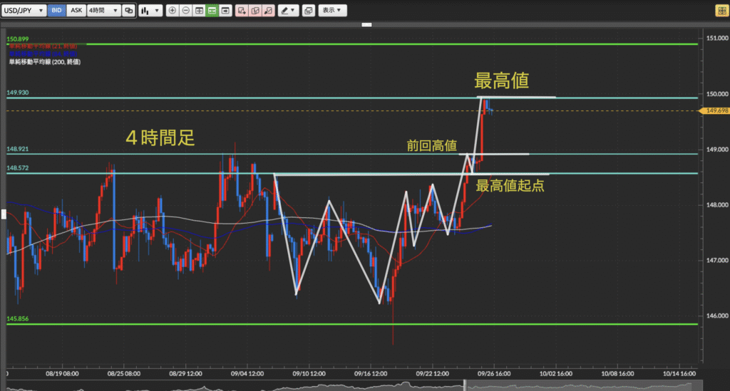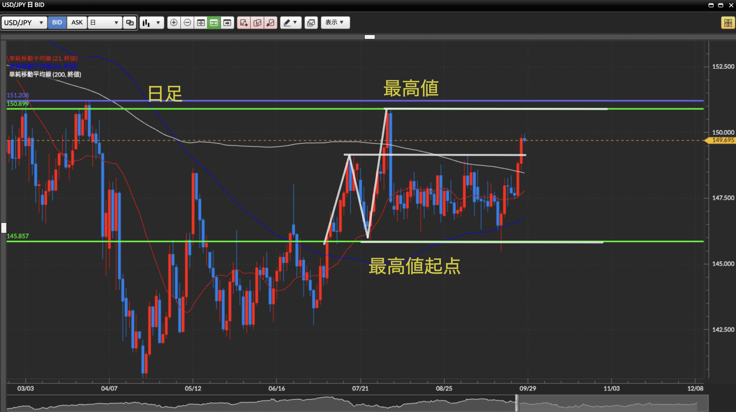 ダウ理論を基に目線の概念、水平線の引き方を理解しているものとして進めさせて頂きます。