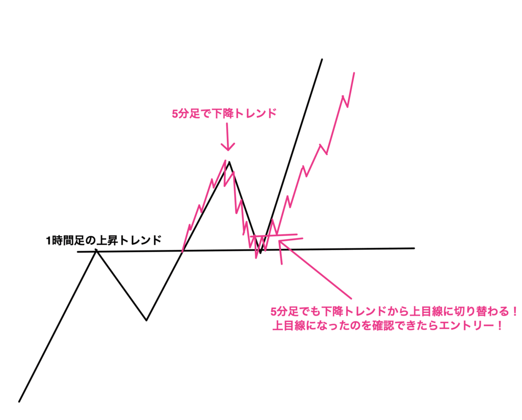 ざっくり言うと、上位足である1時間足に順張り、更に下位足で1時間足と同じ目線に転換してからエントリーする方法です。