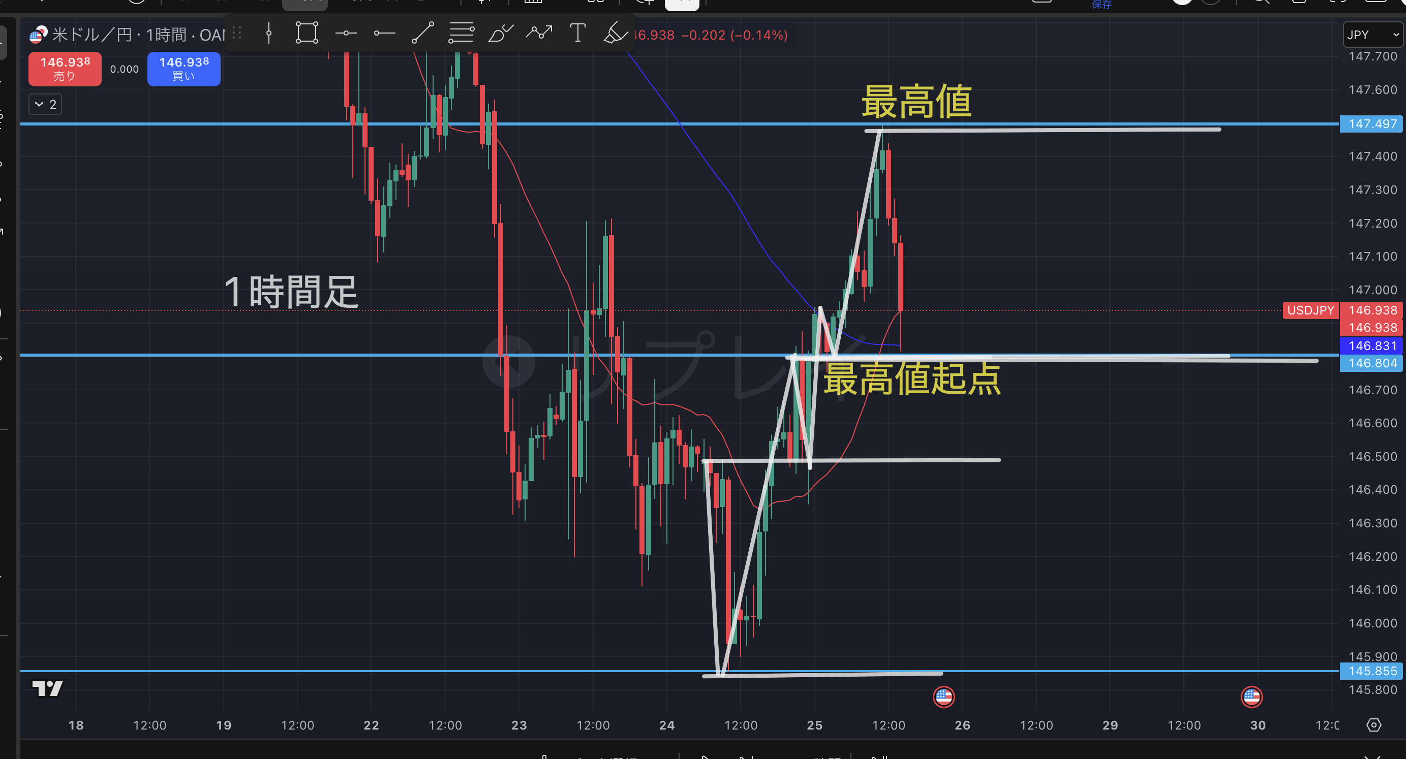 ここでエントリーポイントは1時間足の前回高値か最高値起点に絞れました。