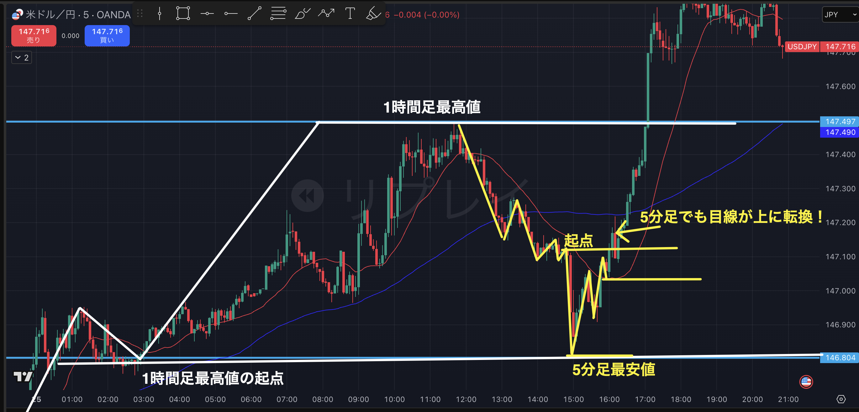 今回は5分足でも目線が上になってからエントリーするパターンです。