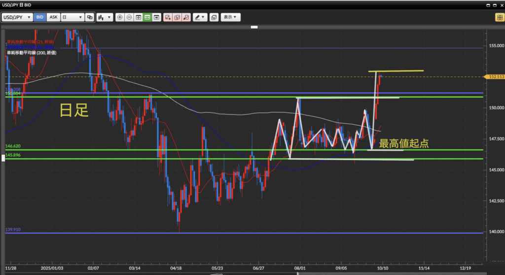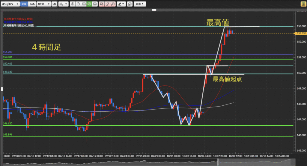 現在の最高値153円キリ番が頭打ちとなり下降相場に転換する可能性もあり。