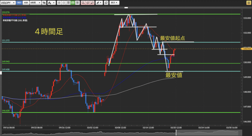 4時間足ではまだ下目線。前回安値も超えてきてはいますね。