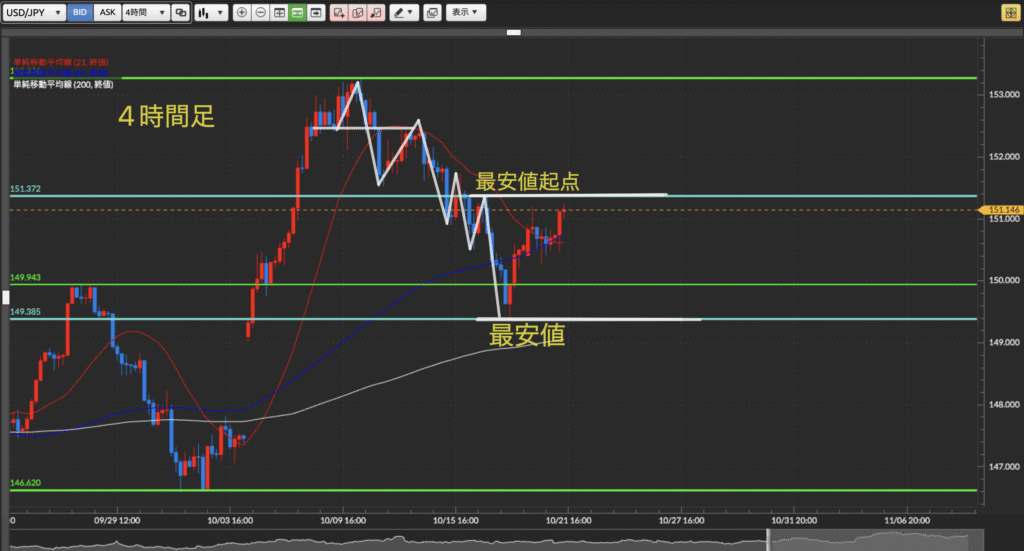4時間足の安値起点をブレイクした後の押し目買いがセオリー。