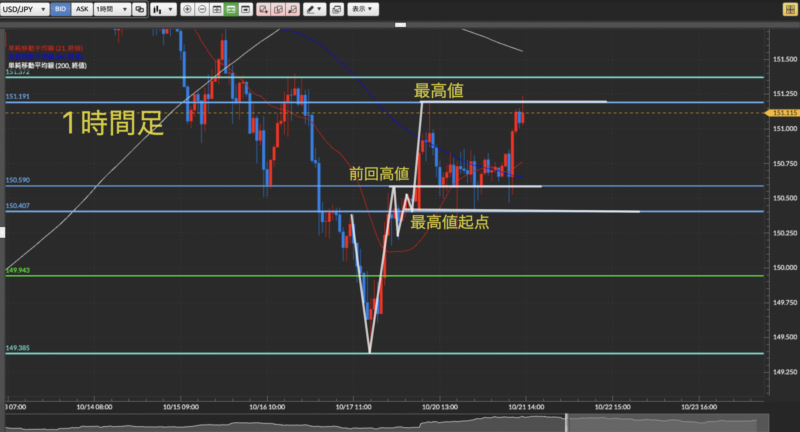 ダウ理論を基に目線の概念、水平線の引き方を理解しているものとして進めさせて頂きます。