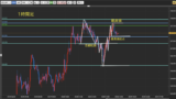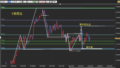 1時間足では乱高下が起こり現状目線は下。一旦目線は気にせず上限下限までは手を出さないほうが安全かと。