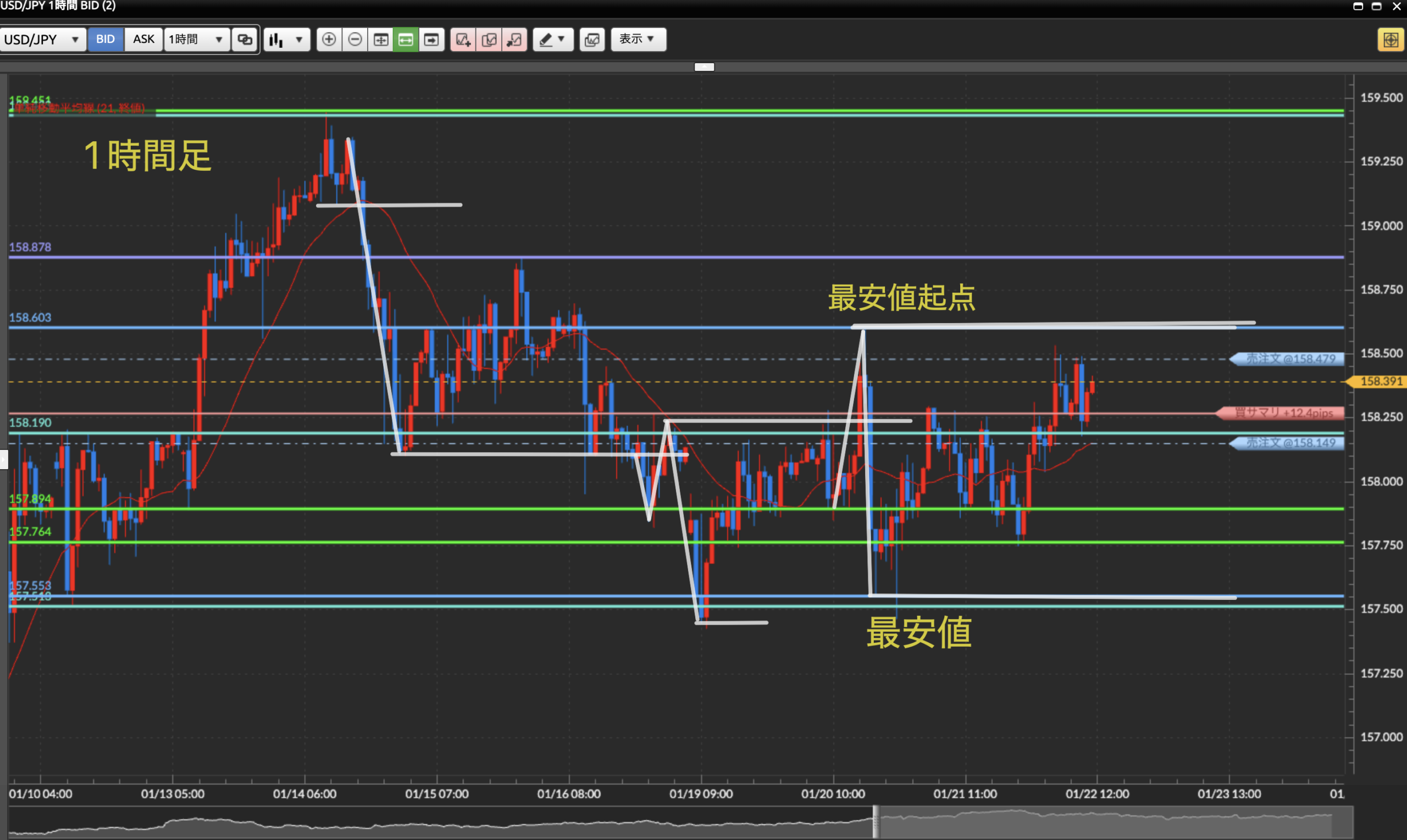 ダウ理論を基に目線の概念、水平線の引き方を理解しているものとして進めさせて頂きます。