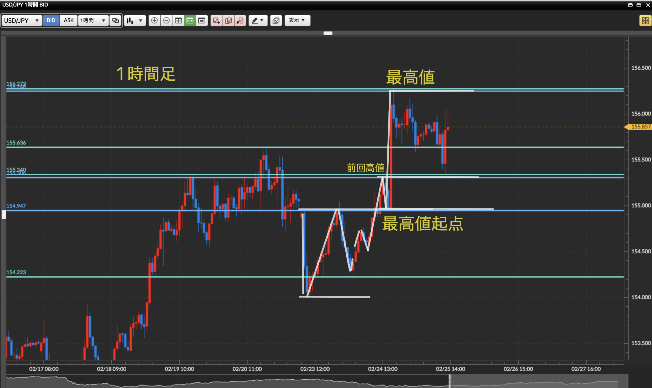 ダウ理論を基に目線の概念、水平線の引き方を理解しているものとして進めさせて頂きます。