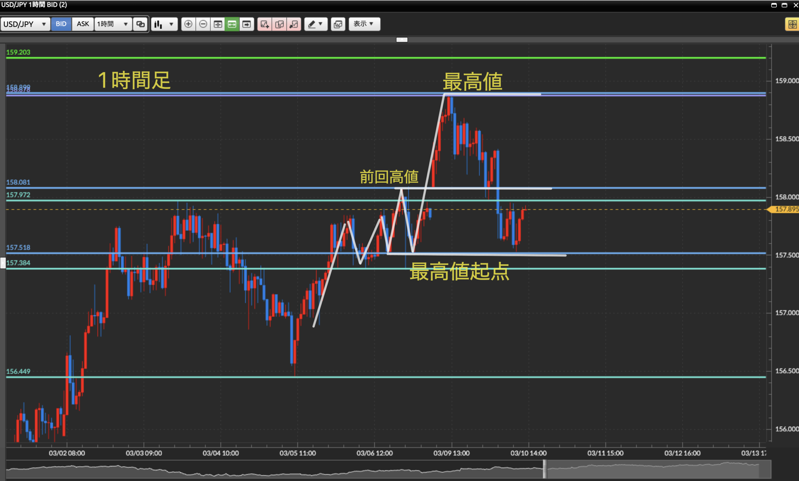 ダウ理論を基に目線の概念、水平線の引き方を理解しているものとして進めさせて頂きます。