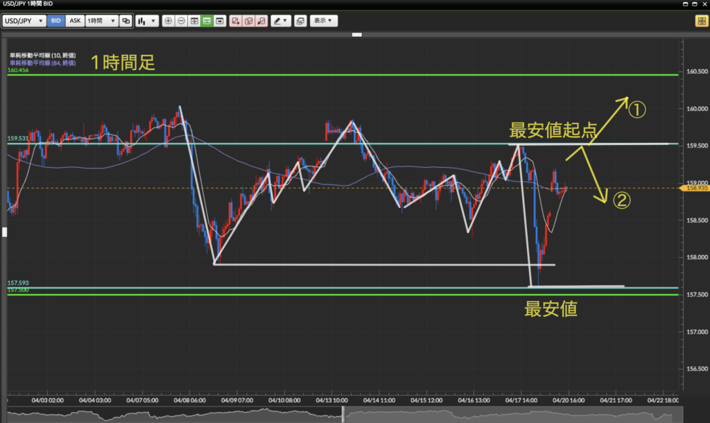 ①4時間、1時間足の起点が同じなのでブレイクで一気に全体的に上目線に!押し目買い戦略で考える