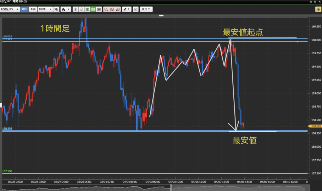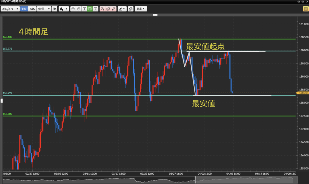 4時間足下目線。起点から一気に下落。