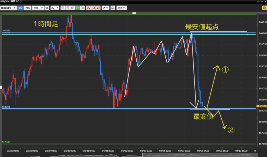 ①4時間足の最安値で反発に転じれば一時的なロング戦略!