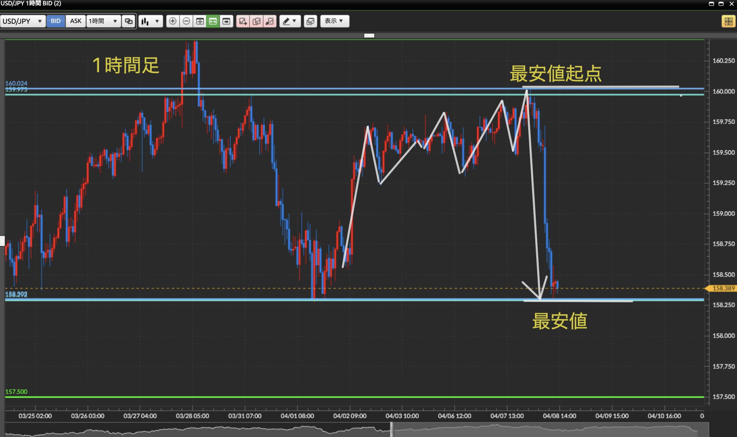 ダウ理論を基に目線の概念、水平線の引き方を理解しているものとして進めさせて頂きます。